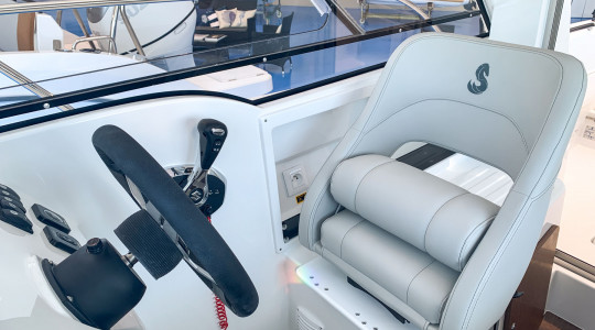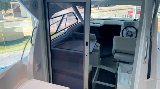 Aquesta distribució ofereix una visibilitat molt bona en tot el seu perímetre i permet al pilot obrir la seva pròpia finestra panoràmica que, al mateix temps que pot gaudir de ventilació directa li permet un cert control de l'exterior de l'embarcació. La doble porta corredissa d’accés des de la banyera de popa acaba de facilitar l’entrada d’aire i llum.