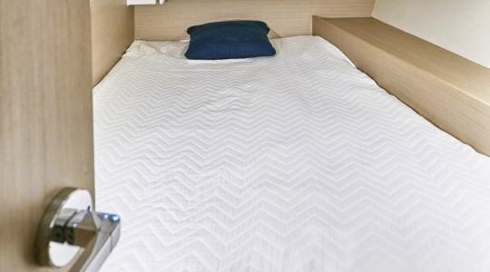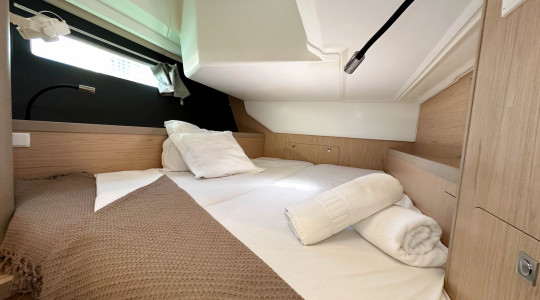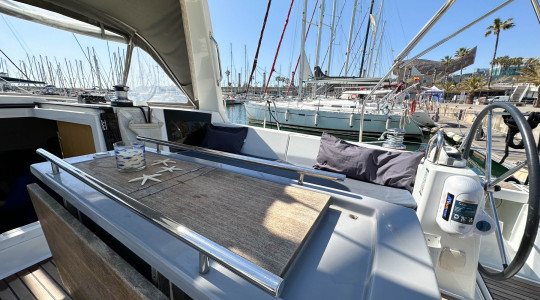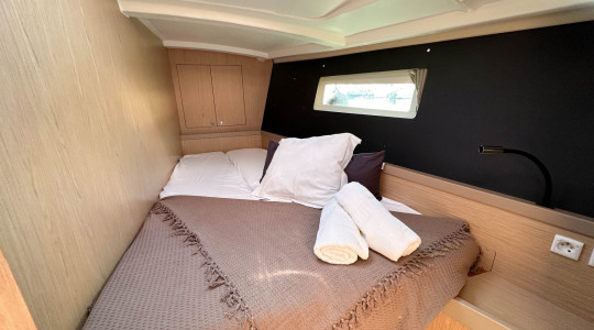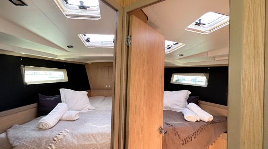 Cuenta con una configuración de 3 cabinas y 2 baños, y está equipado con una amplia gama de extras que garantizan comodidad a bordo y maniobrabilidad sencilla: vela mayor enrollable, hélice de proa, WC eléctrico, plataforma de baño con apertura eléctrica, depósito de agua suplementario, fondo de bañera en teka, cama convertible en el salón y sistema AIS.
