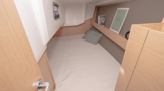The interiors offer a height of 1.98 m, which allows you to circulate comfortably without having to bend down at any time. Its layout consists of 2 double cabins, a separate sink and shower to make life on board easier, a living room where the sofas can become two extra bunks and an L-shaped galley consisting of a 75-litre fridge, stove, oven and ample storage space.