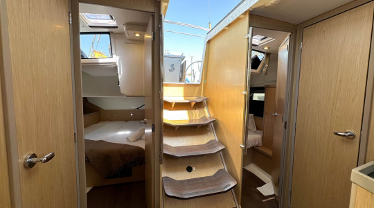 The hatches and the numerous portlights distributed between the hull and the deck allow the entry of a large amount of exterior light and provide very good ventilation. Highlights include the folding chart table in the saloon which, once folded, allows the addition of two extra bunks, the private owner's cabin thanks to a double-leaf door, the kitchen with all the necessary elements for a cruise and a dining area composed by two large sofas and a table with two folding wings.