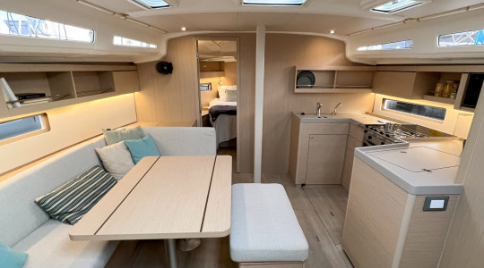 The space and breadth offered by the interior of the Oceanis 40.1 is surprising, since it is far superior to what can be expected from a sailboat of its length. The ceiling height is 1.90 meters and the standard shipowner's cabin has a 1.60m x 2m bed and generous storage capacity. The large amount of natural light that enters through the numerous portholes and hatches helps to increase the feeling of volume, as well as providing very good ventilation.