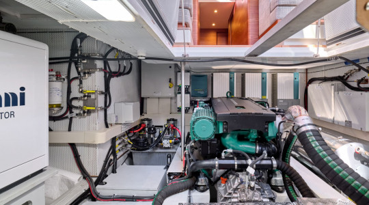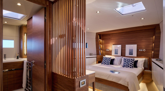 Among the multiple interior configurations, it is worth highlighting the island-shaped bed in the owner's cabin through which it can be accessed from both sides and the compartment between the cabin and the anchor well that can optionally be converted into a single cabin with its own bathroom.