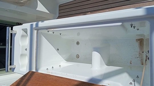 Cubiertas laterales y plataforma de baño revestidas de teca (sellado gris).