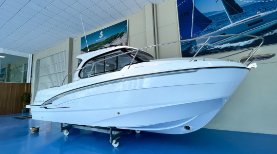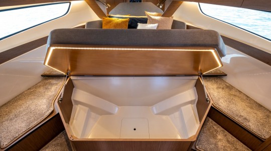 A bordo, destaca por su generoso volumen interior y una distribución inteligente: amplio salón, gran zona de estiba tanto en el salón como en el camarote de proa, y una zona exterior optimizada para el relax. Cuenta con plataformas de baño ampliadas, plataforma lateral abatible con apertura eléctrica, teka en bañera y plataformas, así como propulsor de proa para facilitar las maniobras.