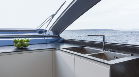Spacieux et lumineux, il apporte le confort nécessaire à la vie de famille à bord, en prêtant également attention au poste de pilotage qui offre une très bonne visibilité, une facilité de manœuvre et une porte latérale qui contribue grandement à la mobilité à bord.