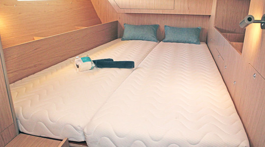 Le plan de pont a été pensé pour que les déplacements, la position à la barre et la vie au mouillage soient à la fois confortables et sécurisés au maximum. Les manœuvres de drisses et d’enrouleur se situent en avant du cockpit tandis que le barreur dispose d’un winch sur chaque bord pour régler les voiles avant. L’ensemble permet d’obtenir un cockpit entièrement dédié au farniente et une circulation fluide pour rejoindre la plateforme de bain.
