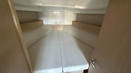 La cabine avant offre une vue magnifique sur la mer grâce à 2 grandes fenêtres. Dans la version avec deux salles de bain, le lit est placé contre le mur droit et est également de bonne taille.