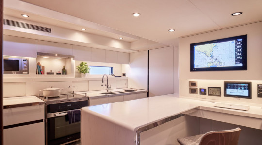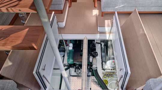 Parmi les multiples configurations intérieures, il convient de souligner le lit en forme d'îlot dans la cabine propriétaire, accessible des deux côtés et le compartiment entre la cabine et le puits d'ancre qui peut éventuellement être converti en une cabine pour skipper avec sa propre salle de bain.