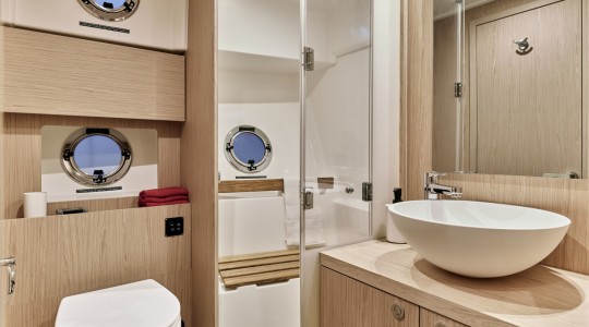 Sur le pont inférieur, il y a 3 cabines doubles avec 2 salles de bain complètes. La cabine propriétaire dispose d'une salle de bain privée, tandis que les cabines invités partagent une salle de bain intégrale. De plus, une machine à laver & sèche linge peut être installée dans le placard de la cabine tribord.