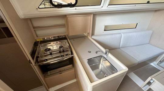 Cuenta con una configuración de 3 cabinas y 2 baños, y está equipado con una amplia gama de extras que garantizan comodidad a bordo y maniobrabilidad sencilla: vela mayor enrollable, hélice de proa, WC eléctrico, plataforma de baño con apertura eléctrica, depósito de agua suplementario, fondo de bañera en teka, cama convertible en el salón y sistema AIS.